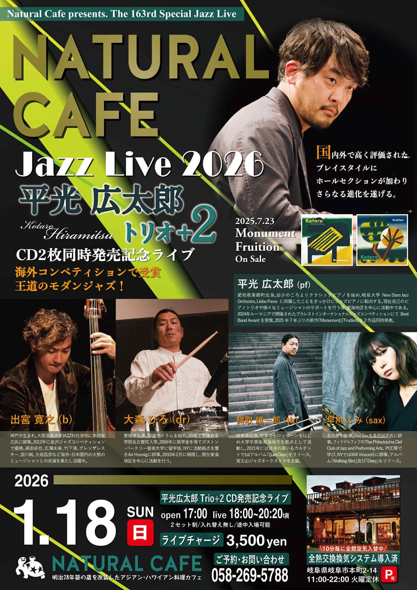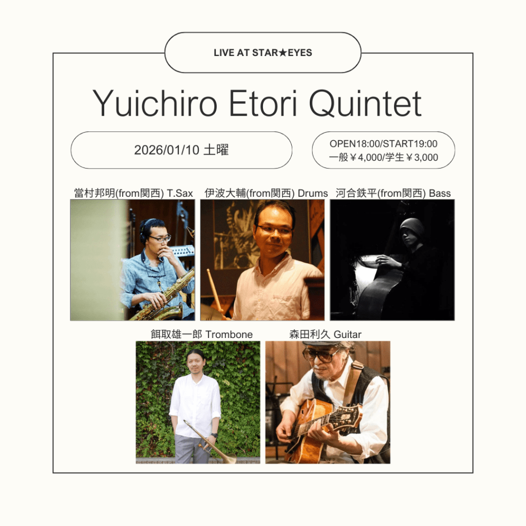 SHOWS 1/10(土)餌取雄一郎クインテット/覚王山スターアイズ 1/18(日)平光広太郎トリオ+2/岐阜ナチュラルカフェ 各公演のご予約、お問い合わせは会場またはこちらへ 共有: クリックして X で共有 (新しいウィンドウで開きます) X Facebook で共有するにはクリックしてください (新しいウィンドウで開きます) Facebook いいね 読み込み中… コメントを残す コメントをキャンセル Δ